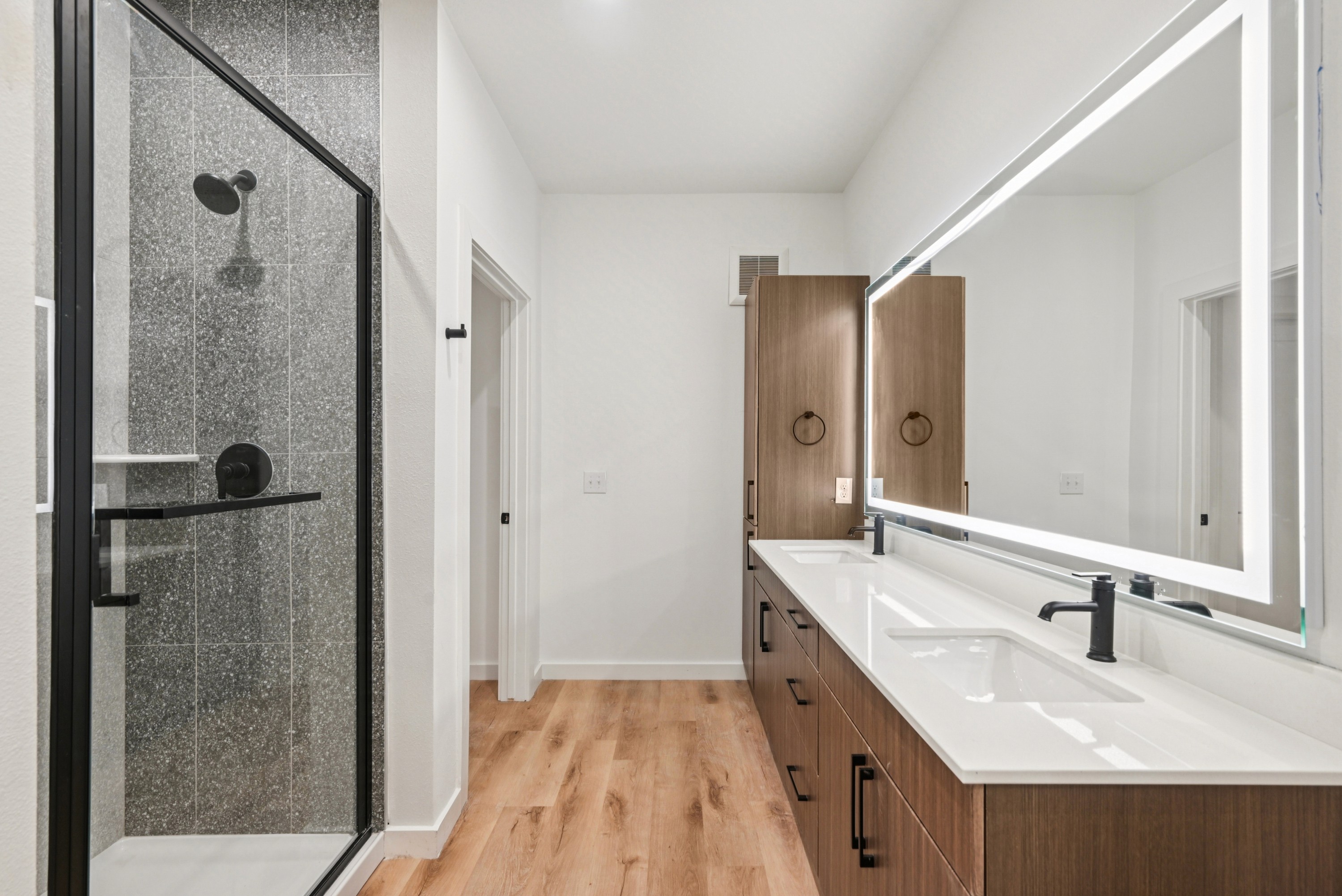 The highest-ROI upgrade we've found is the oversized LED mirror. Even light distribution. Larger visual space. It creates the "tech-forward" impression that resonates with the renter demographic in urban infill — and it does it without a single smart-home subscription.